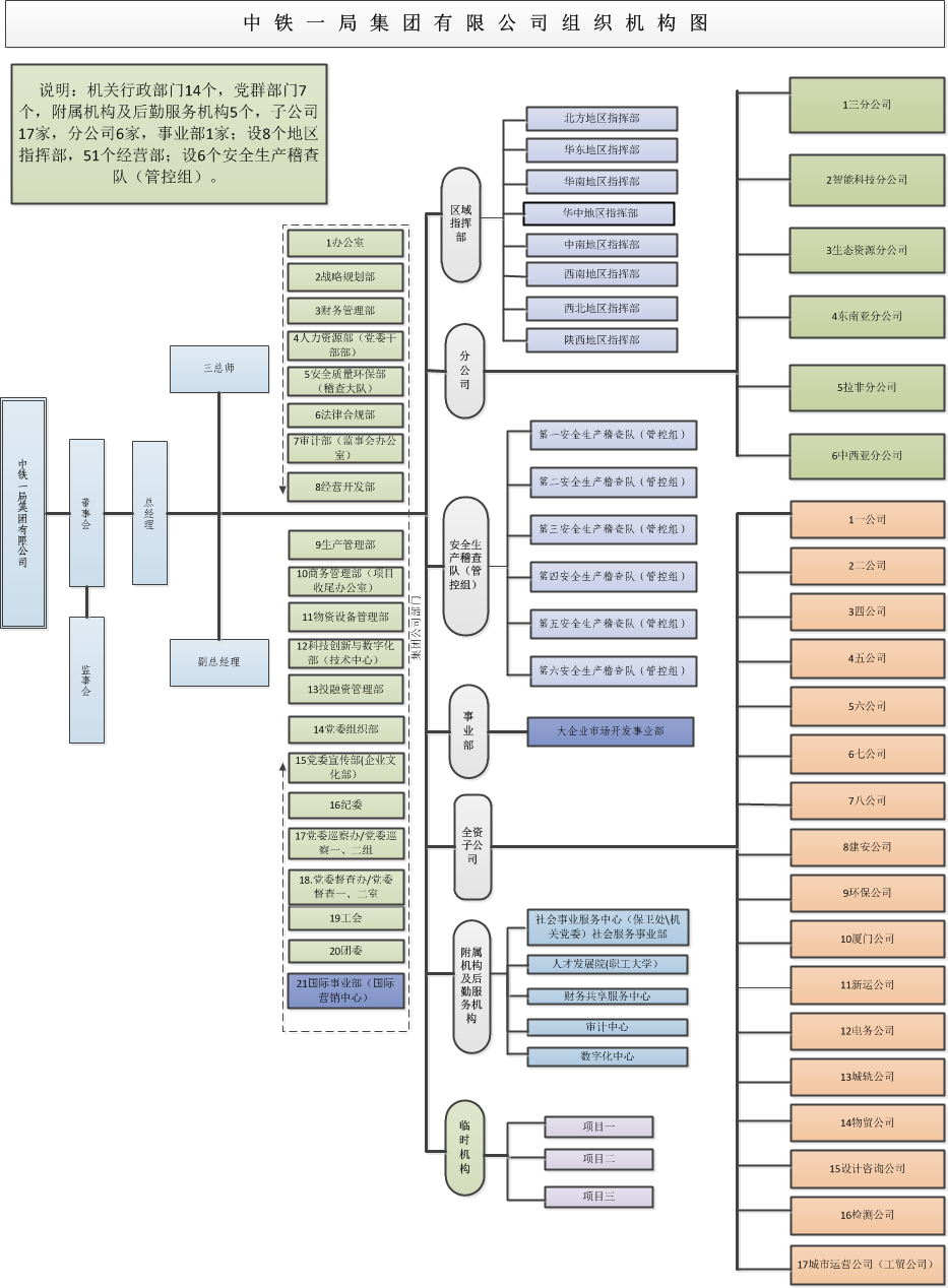 集團公司機關本部共設置21個部門,其中行政部門14個,黨群部門7個(黨委巡察辦、黨委督查辦為一套管理人員,履行相應職責)。行政部門具體為辦公室(黨委辦公室、董事會辦公室、保密委員會辦公室)、戰略規劃部、財務管理部、人力資源部(黨委干部部)、安全質量環保部(稽查大隊)、法律合規部、審計部(監事會辦公室)、經營開發部、生產管理部、商務管理部(項目收尾辦公室)、科技創新與數字化部、物資設備管理部、投融資管理部、國際事業部(國際營銷中心);黨群部門具體為黨委組織部、黨委宣傳部(企業文化部)、紀委、黨委巡察辦、黨委督查辦、工會、團委。集團公司下設8個地區指揮部,51個經營部,負責經營開發工作;設6個安全生產稽查隊(管控組)負責安全監管工作。集團公司下設17家子公司、6家分公司、1家事業部。具體信息附圖