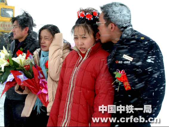 唐古拉山口是生命的禁區,除了這些建設者,看不到任何生命的跡象。婚禮那天,距離“唐古拉山”的界碑還有五百多米,謝學文堅持要把妻子背到山頂。這幾百米謝學文走了十幾分鐘、停了五次。抵達山頂時,鵝毛般的大雪已經讓他們“白了頭”。當地的百姓為一對新人獻上潔白的哈達,感謝建設者們為建設他們的家鄉拋家舍業,克服生理和心理的困難,將祖國的關懷帶到這寒苦之地。