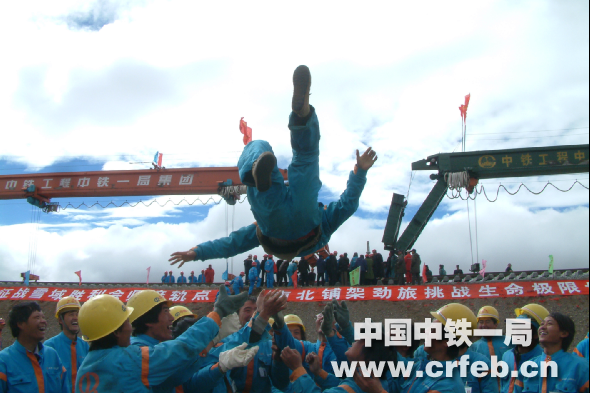 經過建設者艱苦卓絕的努力,2005年8月24日10時,在海拔5072米的唐古拉車站,兩臺鋪軌機伴隨著陣陣的鞭炮聲同時鋪下了最后兩節軌排。那一刻,在場的所有的建設者歡呼雀躍,相擁而泣。高聲呼喊:我們勝利啦!