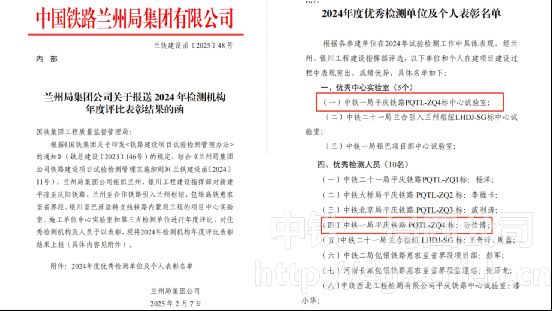 近日,從中國鐵路蘭州局集團有限公司傳來喜訊,中鐵一局平慶鐵路項目試驗室榮獲“2024年度優秀中心試驗室”光榮稱號,項目員工孫佳博同志被授予“2024年度優秀檢測人員”稱號。
