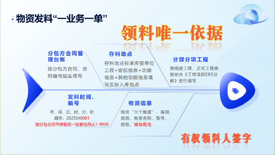 “一業務一單”通常是指企業將每個獨立業務環節標準化為獨立數字化單據或流程,通過規范化的單據設計,明確業務各環節的權責、時間節點和操作要點,通過唯一標識(單號)實現全流程可追溯、可管理。其核心目標是標準化、透明化、高效化業務操作,便于實現業務協同、數據協同,是建立物資收、發全生命周期臺賬的依據和物資數據資產匯集的基礎。