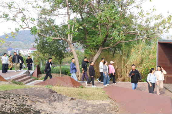 結合員工運動偏好與體驗需求,項目部設計兩條秋游路線:偏好輕度運動的員工,沿“新四軍北撤澉浦之戰紀念碑—垂虹落雁—明星亭—白鷺洲—北湖”路線徒步前行。大家踩著秋意登山攀援、沿湖漫步,盡享運動樂趣;行至新四軍北撤澉浦之戰紀念碑前,全體人員駐足瞻仰,聆聽革命先輩的奮斗故事,在紅色足跡中追溯初心使命。喜愛輕松漫游的員工,則選擇“垂虹落雁—明星亭—白鷺洲—北湖”平緩路線,伴著秋風漫步湖畔,沉浸式感受秋日南北湖的獨特魅力。
