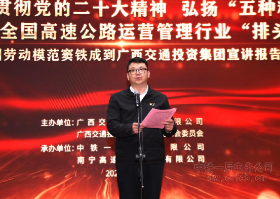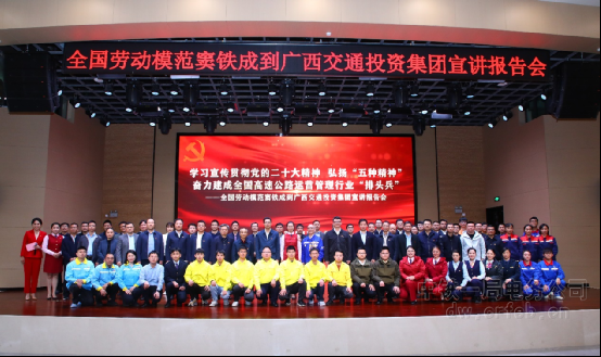 2月24日,由廣西交通投資集團有限公司主辦,中鐵一局集團有限公司、南寧高速公路運營有限公司承辦的“學習宣傳貫徹黨的二十大精神,弘揚‘五種精神’奮力建成全國高速公路運營管理行業‘排頭兵’——全國勞模、全國優秀共產黨員竇鐵成宣講報告會在廣西南寧舉辦。廣西交投集團副總經理陳智杰,中鐵一局集團副總經理尚武孝出席了報告會。
