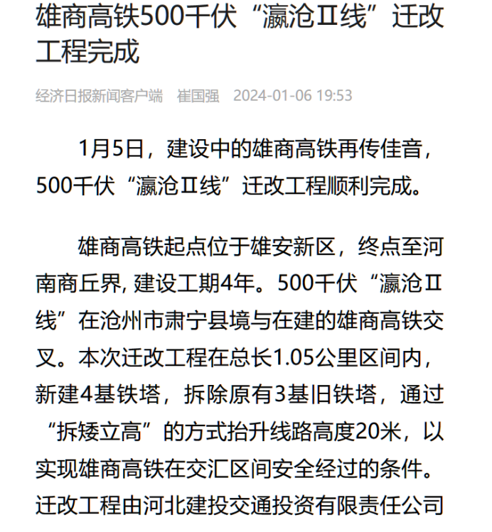 1月5日,建設(shè)中的雄商高鐵再傳佳音,500千伏“瀛滄Ⅱ線”遷改工程順利完成。