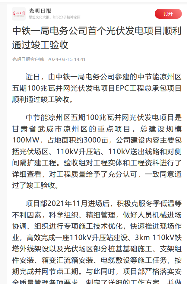 【光明日報】中鐵一局電務公司首個光伏發電項目順利通過竣工驗收