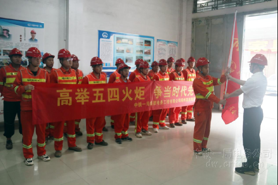五四青年節(jié)到來之際,六分公司特意在項(xiàng)目上組織開展了“青年突擊隊(duì)”授旗儀式,進(jìn)一步激發(fā)項(xiàng)目青年員工的工作激情和干勁。活動(dòng)當(dāng)日,六分公司安質(zhì)總監(jiān)朱江濤對成立“青年突擊隊(duì)”的目的與重要意義進(jìn)行了簡單介紹,并向“青年突擊隊(duì)”隊(duì)長徐祥祥進(jìn)行授旗。徐祥祥帶領(lǐng)全體隊(duì)員進(jìn)行了宣誓,并代表青年突擊隊(duì)作表態(tài)發(fā)言。
