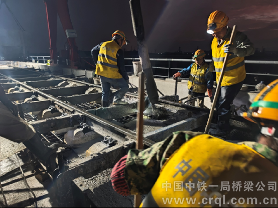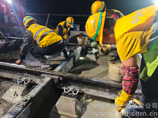 為確保施工質(zhì)量安全,項(xiàng)目部提前組織人員勘察現(xiàn)場,針對長軌件吊裝、精準(zhǔn)定位、混凝土澆筑等關(guān)鍵環(huán)節(jié)制定專項(xiàng)施工方案。施工過程中,技術(shù)團(tuán)隊(duì)嚴(yán)格把控測量精度,采用專業(yè)設(shè)備將道岔安裝與軌距誤差控制在毫米級,并在現(xiàn)場人員的協(xié)調(diào)配合下分六次完成209余方混凝土澆筑及交叉作業(yè)銜接等工序,為后續(xù)鋪軌奠定了堅(jiān)實(shí)基礎(chǔ)。