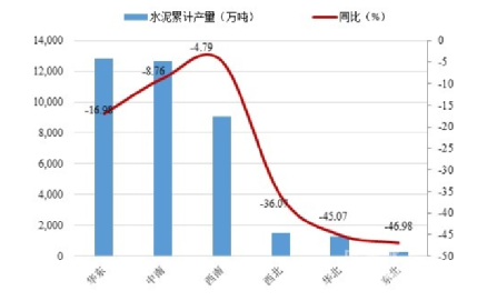 全國六大區域中水泥累計產量均同比下滑,東北、華北和西北地區水泥產量急劇下滑,其中東北和華北地區自2017年起增速就持續下滑,西北地區自2017年6月份增速轉正為負后一路下滑。西南地區從2017年下半年開始下滑,華東和中南地區從2017年底開始下滑。