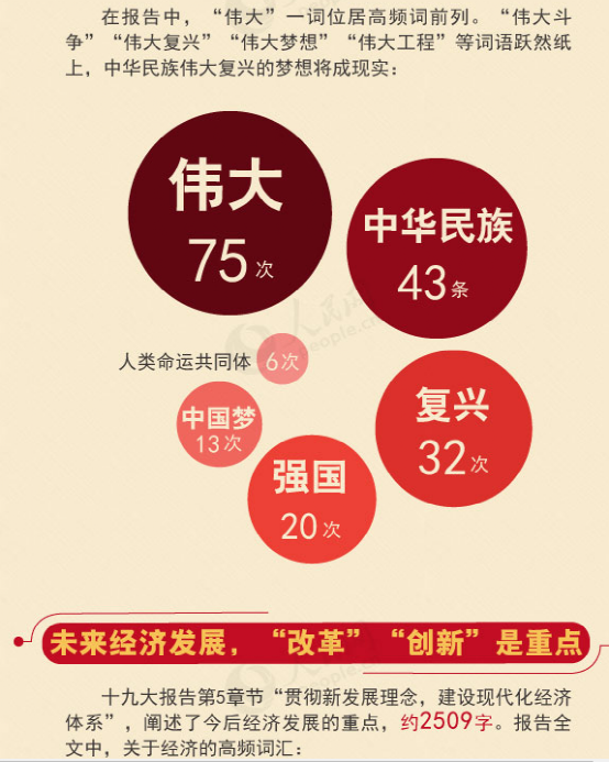 偉大75次,中華民族43條,復(fù)興32次,強(qiáng)國(guó)20次,中國(guó)夢(mèng)13次,人類命運(yùn)共同體6次。