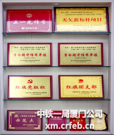 因標(biāo)準(zhǔn)化建設(shè)成效顯著,項(xiàng)目部各項(xiàng)工作變得更加順暢,各種榮譽(yù)也接踵而至,獲得廈門(mén)市“無(wú)欠薪標(biāo)桿項(xiàng)目部”、廈門(mén)市“五一先鋒號(hào)”、廈門(mén)市“揚(yáng)塵考評(píng)第一名”、中國(guó)中鐵綠色施工科技示范工程、中鐵一局“紅旗黨組織”稱號(hào)等;在廈門(mén)軌道集團(tuán)半年度信用評(píng)價(jià)中兩次獲得第一名好成績(jī),被授予“重合同守信用單位”金色牌匾;在中鐵南方投資集團(tuán)信用評(píng)價(jià)中取得第一名好成績(jī);工程建設(shè)亮點(diǎn)等被工人日?qǐng)?bào)、廈門(mén)晚報(bào)、廈門(mén)日?qǐng)?bào)等多家媒體相繼報(bào)道。